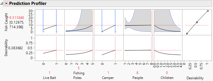 A function is imposed on the response, which indicates that maximizing the number of Fish Caught is desirable. (See Desirability Profiling and Optimization the Profilers book for more information about desirability functions.)