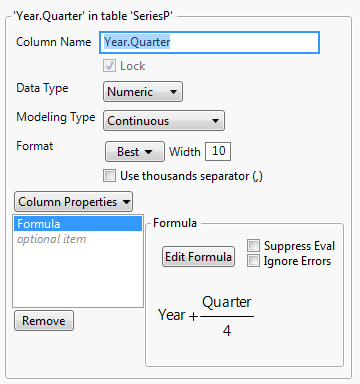 The SeriesP.jmp data table contains a Year column and a Quarter column to identify the time period during which the responses were observed. However, the Time Series platform requires one column with unique, equally spaced time points to label the X axis. If no Time ID is specified, then the row number is used to identify the time periods. To avoid this and make the report easier to interpret, you construct a Time ID column from Year and Quarter.