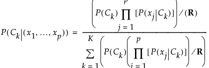 where R is a regularization constant. In the formula above, the conditional probability that an observation with Xj = xj belongs to the class Ck, P(xj|Ck), is given as follows: