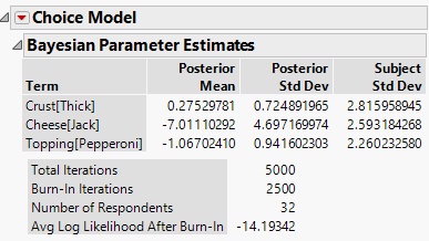 (Appears only if Hierarchical Bayes is selected on the launch window.) The Bayesian Parameter Estimates report gives results for model effects. The estimates are based on a Hierarchical Bayes fit that integrates the subject-level covariates into the likelihood function and estimates their effects on the parameters directly. The subject-level covariates are estimated using a Bayesian procedure combined with the Metropolis-Hastings algorithm. See Train (2001). Posterior means and variances are calculated for each model effect. The algorithm also provides subject-specific estimates of the model effect parameters. See Save Subject Estimates.