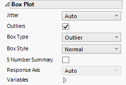 shows outlier or quantile box plots. A box plot provides a compact view of a distribution of values. The box plot element is useful when variables have a Numeric data type. For details about outlier and quantile box plots, see Outlier Box Plot and Quantile Box Plot in the Basic Analysis book.