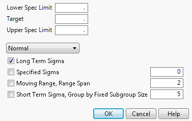 The Capability Analysis window appears when you select the Capability Analysis option from the red triangle menu next to the name of the analysis variable and the corresponding column does not contain a Spec Limits column property. For an example of using this window, see Example of Capability Analysis.