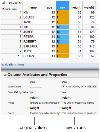 Select Compare Column Attributes and Properties from the red triangle menu to see differences in column notes, cell colors, and the like. For example, Figure 3.27 shows that column notes and value colors differ in Big Class2.jmp.