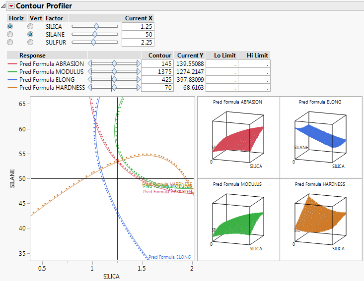 The Contour Profiler shows response contours for two factors at a time. The interactive contour profiling facility is useful for optimizing response surfaces graphically.