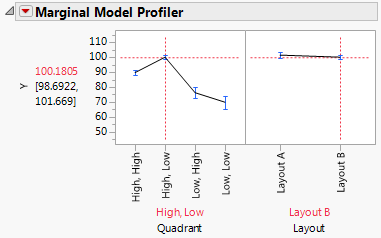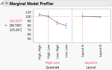In the Profiler plot, compare the predicted values for Y across the quadrants by first setting the vertical red dotted line at Layout A and then at Layout B.