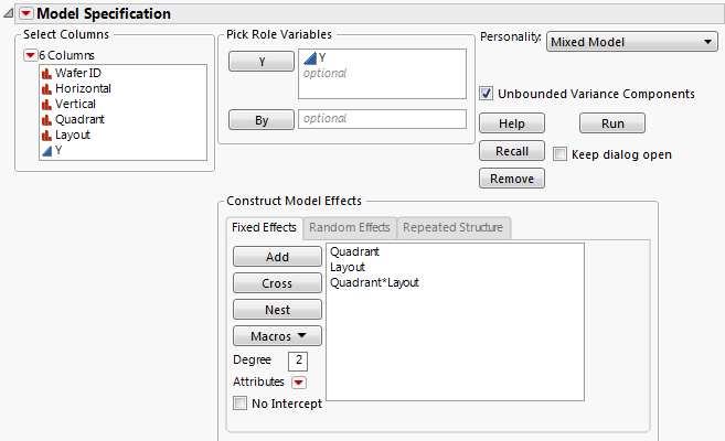 Since there is a Model script in the data table, the Model Specification window is already filled in. Note that the columns High, High through Low, Low are entered as Y and that Layout is the single model effect.