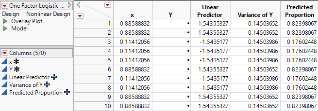 The One Factor Logistic Design.jmp data table, found in the Design Experiment folder, contains the following: