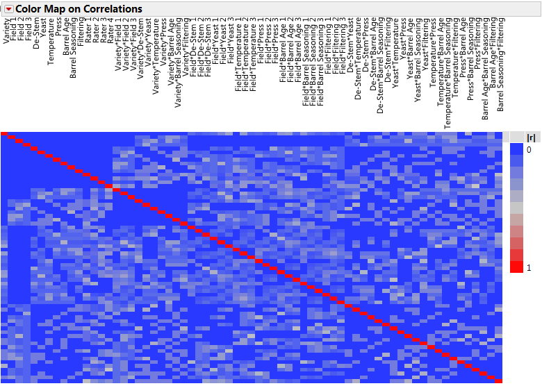 The Color Map on Correlations shows the absolute value of the correlation between any two effects that appear in either the Model or the Alias Terms outline. (The colors shown in Figure 3.6 are the JMP default colors.)