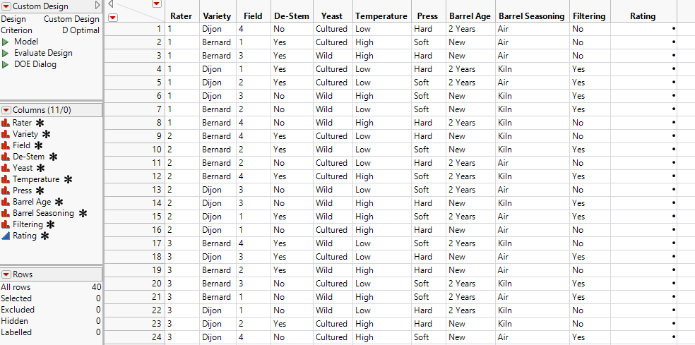 Note: Your table might look different because the algorithm that creates it uses a random starting design. To obtain the precise table shown in Figure 3.9, follow the steps in Duplicate Results (Optional).