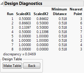 JMP creates the design and displays the design runs and the design diagnostics. Figure 20.8 shows the Design Diagnostics panel with 0.518 as the Minimum Distance. Your results might differ slightly from the ones below, but the minimum distance is the same.