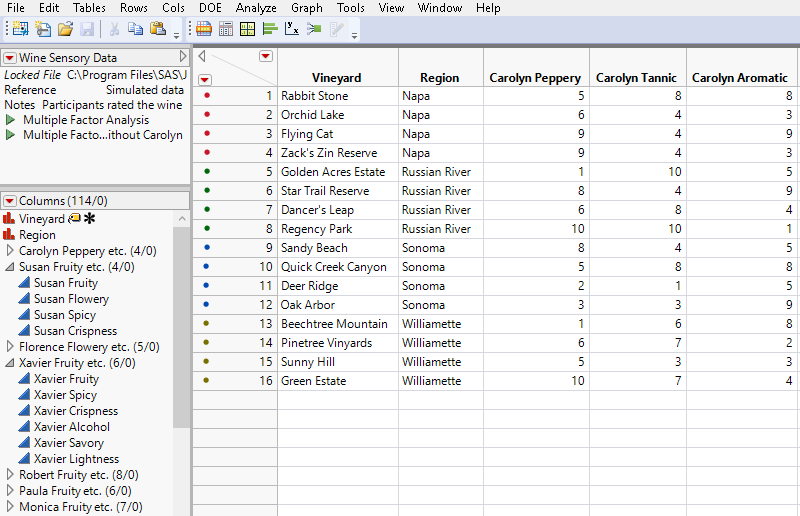 The data table rows represent the items that are being measured. Observations for each item must be in a single row. For example, Figure 8.5 shows a table that is measuring attributes of 16 wines from different vineyards. The column panel shows the column groups, or sub-tables, for each panelist.