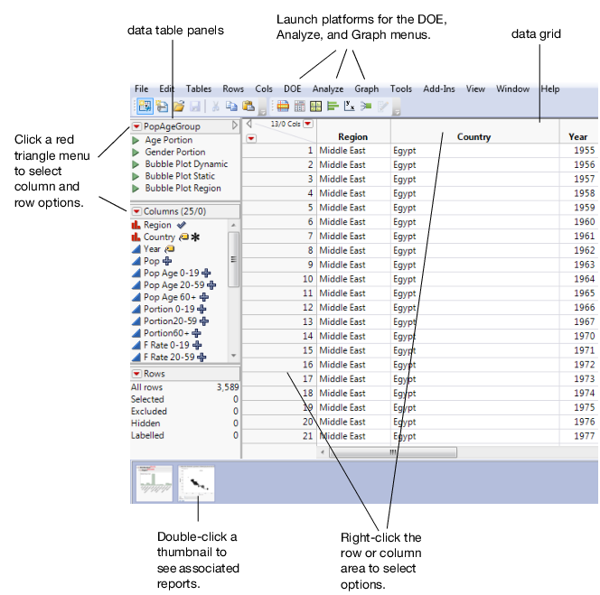 In JMP, data points are organized into rows and columns referred to as the data table. A data table has two parts: the data table panels on the left and the data grid on the right.