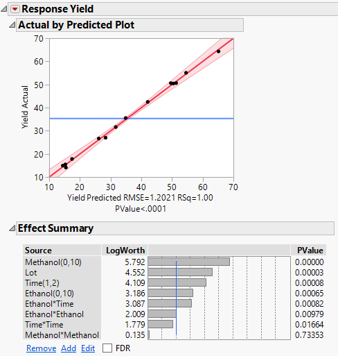 The Actual by Predicted Plot shows no evidence of lack of fit. The Effect Summary report shows that Methanol*Methanol is not significant. You decide to remove this effect from the model.