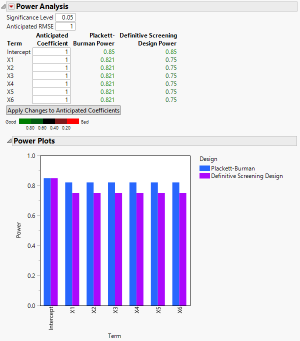 In terms of power, prediction variance, and estimation efficiency, the PB design outperforms the DSD. Figure 15.3 shows the Power Analysis report with the default settings for the significance level, Anticipated RMSE, and coefficients. For tests for the main effects, the PB design has higher power than does the DSD.