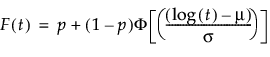 See Tobias and Trindade (1995, p. 232) for more information about reliability distributions. This reference gives the general form for mixture distributions. Using the parameterization in Tobias and Trindade, the form above can be found by substituting α = p, Fd(t) = 1, and FN(t) = Φ(t).