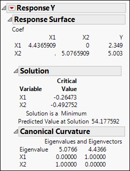 The Solution report shows the critical values. These are the values where a maximum, a minimum, or a saddle point occur. In this example, the Solution report indicates that the response surface achieves a minimum of 54.18 at the critical value, where X1 = -0.265 and X2 = -0.493.
