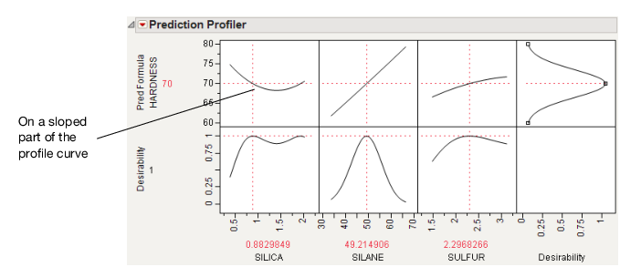 We get the following Prediction Profiler display. Notice that the SILICA factor’s optimum value is on a sloped part of a profile curve. This means that variations in SILICA are transmitted to become variations in the response, HARDNESS.