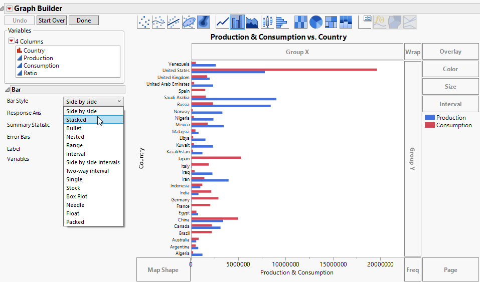 The levels of Country are now ordered by Consumption. The countries that consume the most oil appear at the top of the graph. You can also see each country’s oil production.