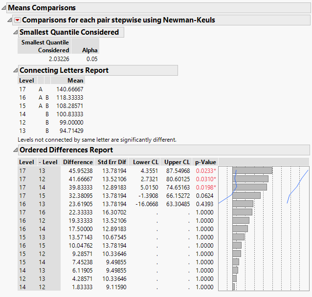 In Figure 5.71, the Ordered Difference Report shows that five mean comparison tests were performed before there was a non-significant result and the procedure was stopped. Level 17 is significantly different from all other levels except 16 and 15. The last test performed was between level 16 and level 13. Since there are 5 means between and including these levels, the Smallest Quantile Considered is the quantile for Tukey’s HSD with 5 group means.