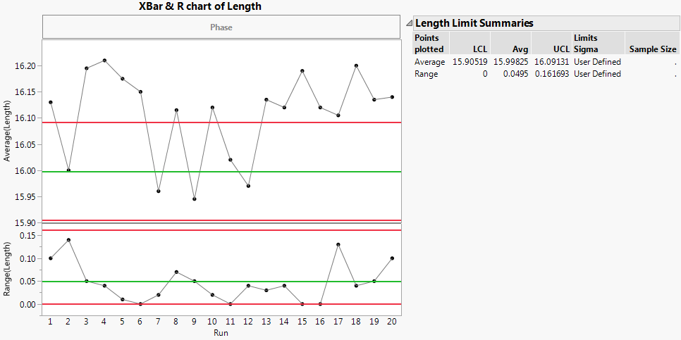 Click the Control Chart Builder red triangle and select Get Limits. Navigate and open the limits data table for this example, called Length Limits.jmp. By default, the file is located here: