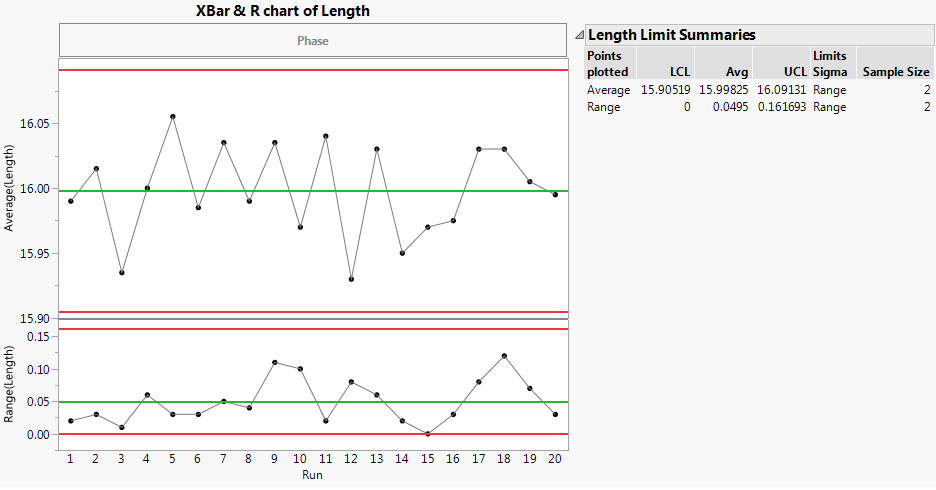 Figure 2.8 XBar and R Chart of Line Length by Print Run