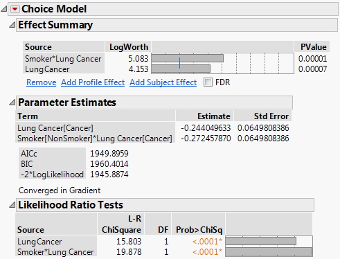 Notice that the likelihood ratio chi-square test for Smoker*Lung Cancer in the Choice model matches the likelihood ratio chi-square test for Smoker in the Logistic model. The reports shown in Figure 5.40 and Figure 5.41 support the conclusion that smoking has a strong effect on developing lung cancer. See Logistic Regression Models in the Fitting Linear Models book for more details.