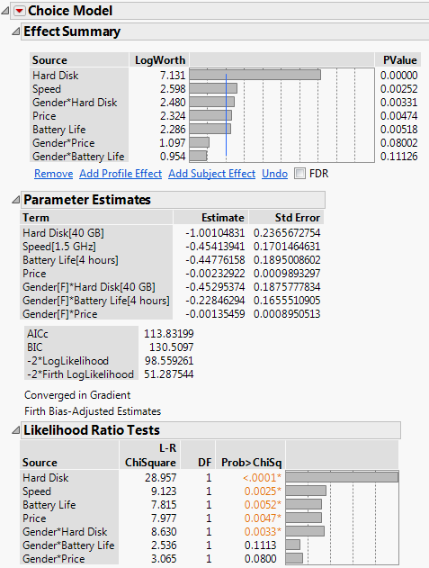 In the Laptop Runs.jmp sample data table, click the green triangle next to the Choice Reduced Model script.