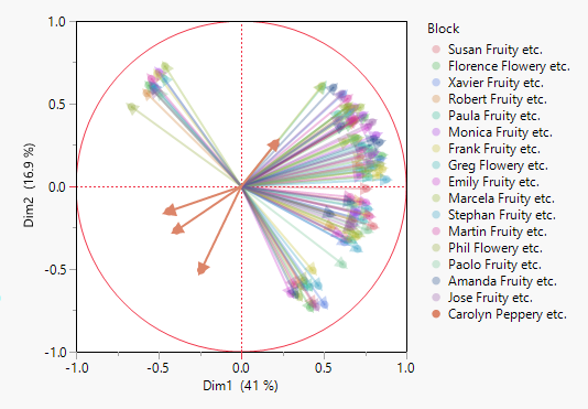 In the legend next to the loading plot, click Carolyn Peppery etc. to highlight her results.