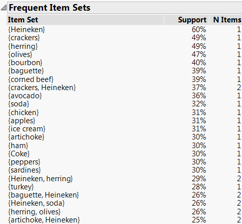 The Frequent Item Sets report shows that 36% of customers purchased avocados. The Rules report in Figure 20.2 shows that 58% of these customers also bought artichokes. Because of the large proportion of customers who follow this behavior, the grocery store management might use this information to strategically locate avocados and artichokes.