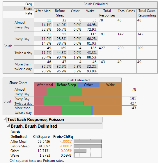 The p-values show that the response rates for After Meal, Before Sleep, and Other are significantly different across brushing groups. Wake is not significantly different across brushing groups. From the Crosstab table, you can see that most people brush their teeth when they wake up regardless of how frequently they brush their teeth.