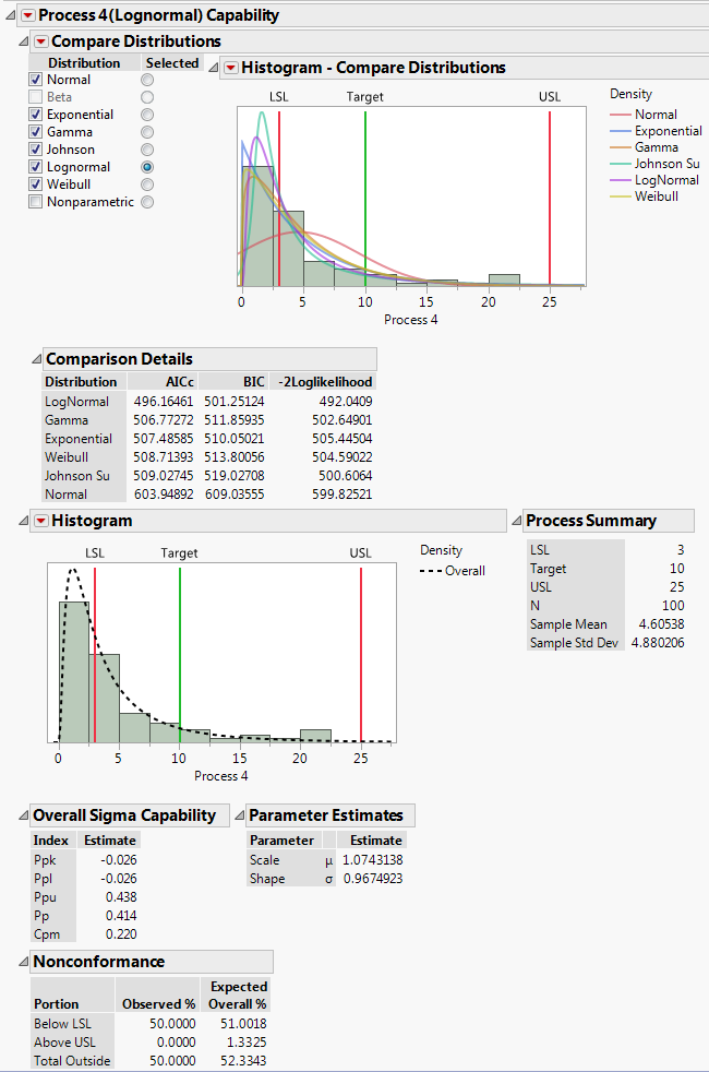 The title of the report for Process 4 indicates that the capability calculations are based on a lognormal fit. All of the check boxes in the Compare Distributions report, except the boxes for Nonparametric and Beta, are checked, indicating that these six distributions are fit. (This is because you requested a Best Fit in the launch window.) The button that is selected in the Selected column indicates that the Lognormal distribution is the distribution that is used in the remainder of the Process 4(Lognormal) Capability report to estimate capability and nonconformance.
