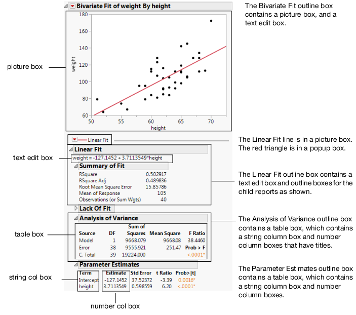biv = dt << Bivariate( Y( :weight ), X( :height ), Fit Line() );
