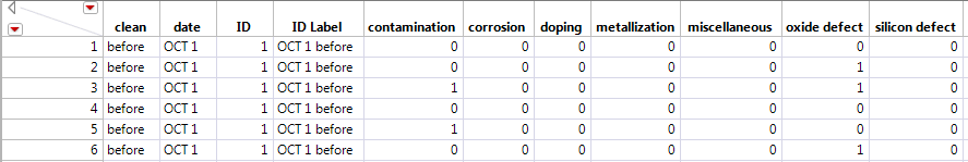 The Failure3Freq.jmp sample data table has a row for each batch, columns for each defect type, and a column for the batch size. The data entries in the defect columns are the frequency of occurrence of the defect in the batch.