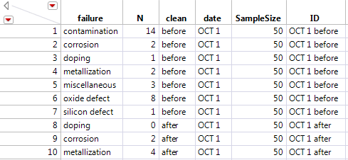 The Failure3ID.jmp sample data table has a row for each defect type within each batch, a column for the number of each defect type, and an ID column for each batch.