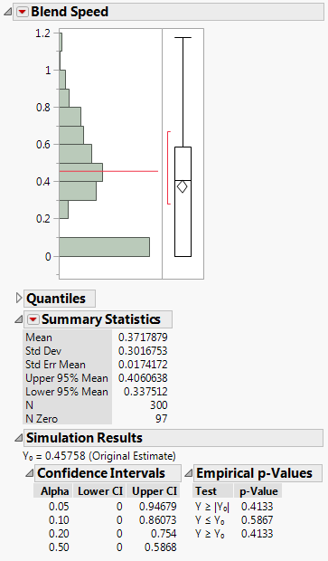 The Summary Statistics report shows that for 97/300 = 32.3% of the simulations, the Blend Speed estimates are zero.