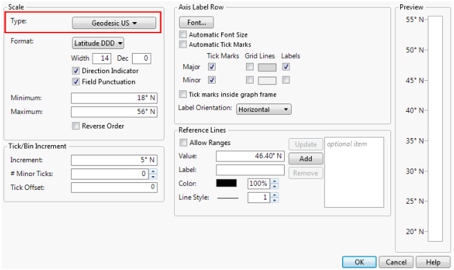 The graph is a typical graph in JMP, which means that all the regular JMP controls are available to you. You can adjust the axes or use the zoom tool (found on the hidden menu bar) just as you would in JMP. You can also right-mouse-click to select Size/Scale > Size to Isometric to return the graph to a proper aspect ratio. You can also select Background Map, where you can adjust the boundary map.