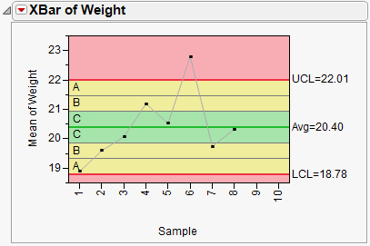 Shows or hides the zone lines. The zones are labeled A, B, and C as shown here in the Mean plot for weight in the Coating.jmp sample data. Control Chart tests use the zone lines as boundaries. The seven zone lines are set one sigma apart, centered on the center line.