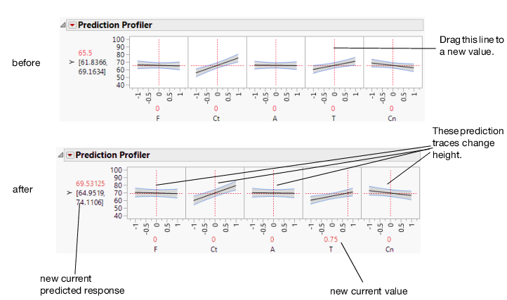 If you change the value of a factor, the prediction trace for that factor is not affected, but the prediction traces of all the other factors can change. The Y response line must cross the intersection points of the prediction traces with their current value lines.