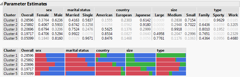 Latent class analysis enables you to find clusters of observations for categorical response variables. A latent variable is an unobservable grouping variable. Each level of the latent variable is called a latent class. The Latent Class Analysis platform fits a latent class model and determines the most likely cluster or latent class for each observation. In most situations, a subject matter expert uses the results of a latent class analysis to create definitions for each latent class based on the characteristics of the class.