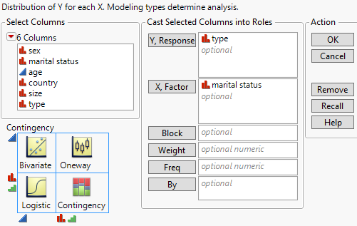 Note: You can also launch a contingency analysis from the JMP Starter window. Select View > JMP Starter > Basic > Contingency.