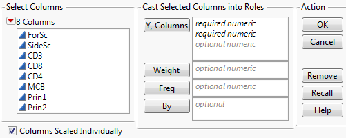 Launch the K Means Cluster platform by selecting Analyze > Clustering > K Means Cluster. Figure 11.6 shows the Clustering launch window for Cytometry.jmp.