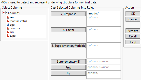 Assigns the categorical columns to be analyzed. In MCA, you are generally interested in the associations between variables, but there are not explicit “explanatory” and “response” variables.