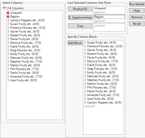 If you group the columns into blocks before running the platform, you can select multiple column groups and cast them as blocks in a single action. Otherwise, you must select each group of columns for each block and click Add Block, one block at a time. Double-click on a block name to change it.