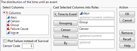 Launch the Survival platform by selecting Analyze > Reliability and Survival > Survival.