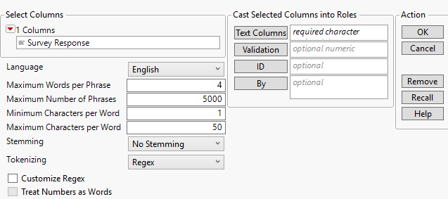 After you click OK on the launch window, the Text Explorer Regular Expression Editor window appears if you selected Customize Regex in the launch window. Otherwise, the Text Explorer report appears.