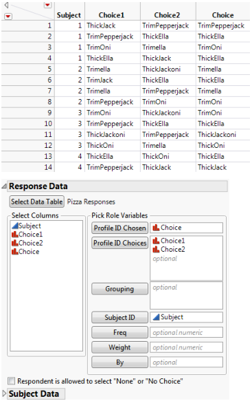 The response data table includes a subject identifier column, columns that list the profile identifiers for the profiles in each choice set, and a column containing the preferred profile identifier. There is a row for each subject and choice set. Grouping variables can be used to distinguish choice sets when the data contain more than one group of choice sets. Figure 5.15 shows the Pizza Responses.jmp data table and a completed Response Data panel.