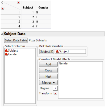 The subject data table is optional and depends on whether you want to model subject effects. The table contains a column with the subject identifier used in the response table, and columns for attributes or characteristics of the subjects. You can put subject data in the response data table, but you should specify the subject effects in the Subject Data outline. Figure 5.16 shows the Pizza Subjects.jmp data table and a completed Subject Data panel.