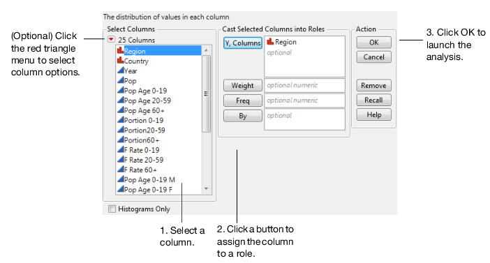 The launch window is your point of entry into a platform, where you specify the columns to analyze. Figure 1.2 shows the Distribution launch window.