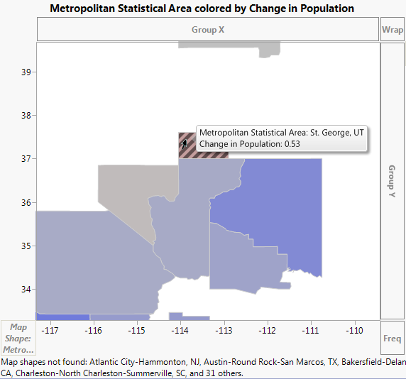 Once the Map Role column property has been set up, you can perform your analysis. You want to visually see how the population has changed in the metropolitan statistical areas of the United States between the years 2000 and 2010.