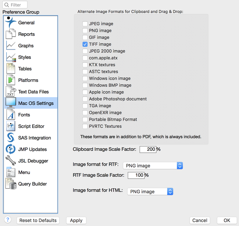 Select one or more graphic formats to use when copying and pasting (or dragging and dropping) graphics from JMP into other applications.